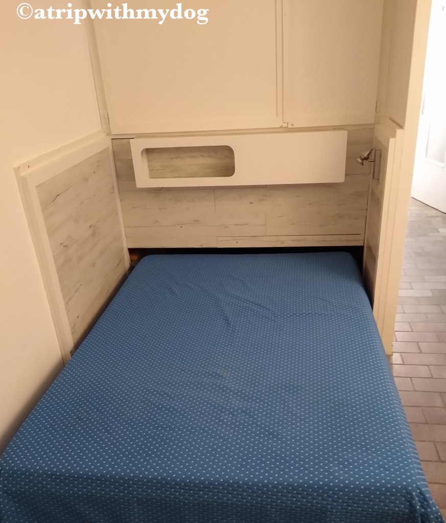 There is a large double bed that you can roll into and out of a holding area, so during the day it can serve as a couch and you have more space in the apartment. On top of the holding area of the double bed, but separated by a wall section that can be opened or closed are two single beds. It might sound confusing but it’s hard to explain. The gist of it is that you can basically create two separate bedrooms that sleep two people each, but during the day you can use the living room without having any bed in the way. So smart!