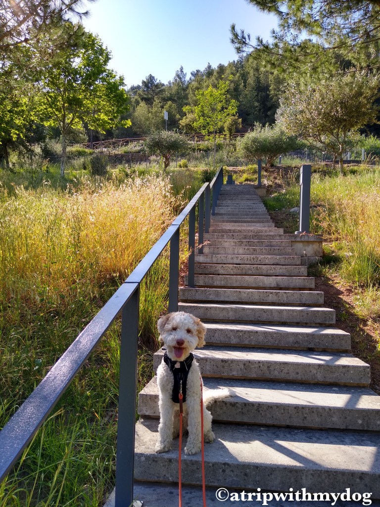 The ascent consists of some stairs followed by a short walk on the side of a road, but thankfully it quickly turns onto a dirt road where you are unlikely to encounter cars and your dog can happily sniff around.