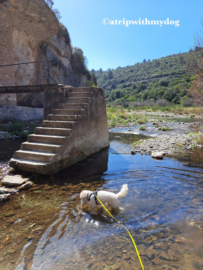 As you follow the route through the town, eventually you get down to the river. For humans, there are a few stones to step across to the stairs, but of course my dog had to take advantage and cool off in the river first.