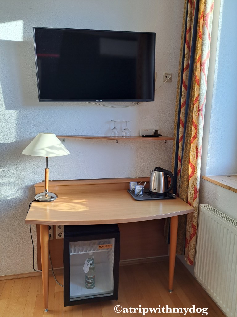 The room was quite nice, with a large bed, an armchair and a desk. There was also a fridge which I always find convenient when traveling, and a free bottle of water was also provided. The bed in particular was very comfortable, I slept great. The room was also relatively spacious.