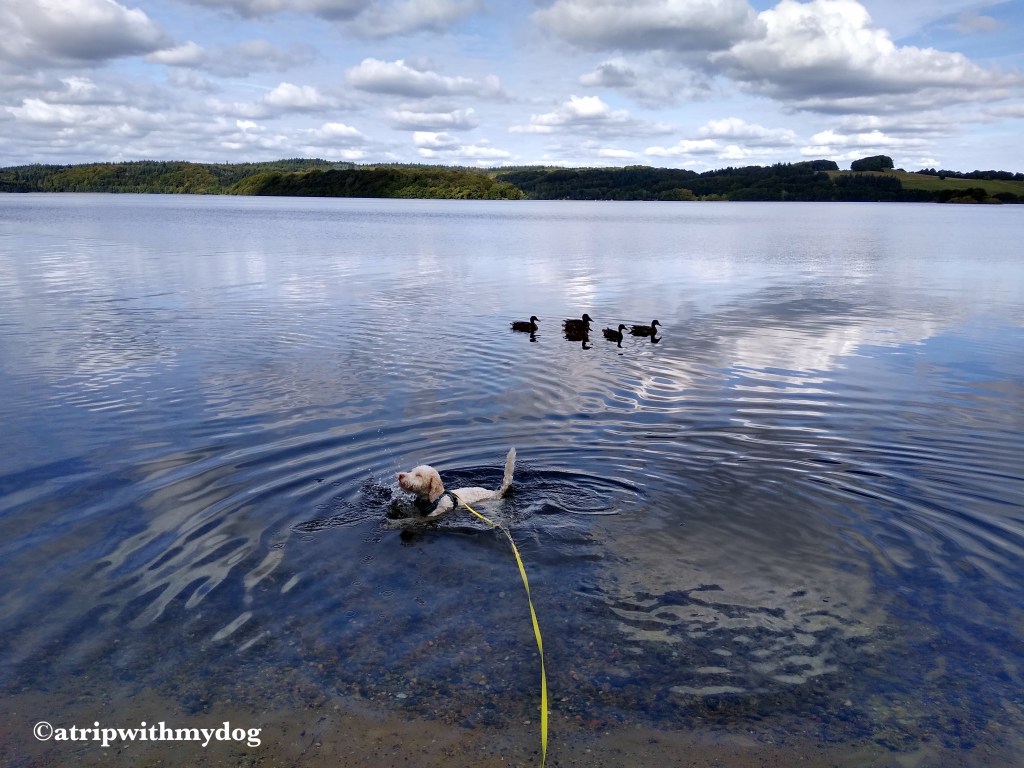 After admiring the view, we eventually made our way down the hill through the forest, following the red trail to the water’s edge near the Julsø hotel. Of course my dog could not resists taking a refreshing bath in Lake Julsø.